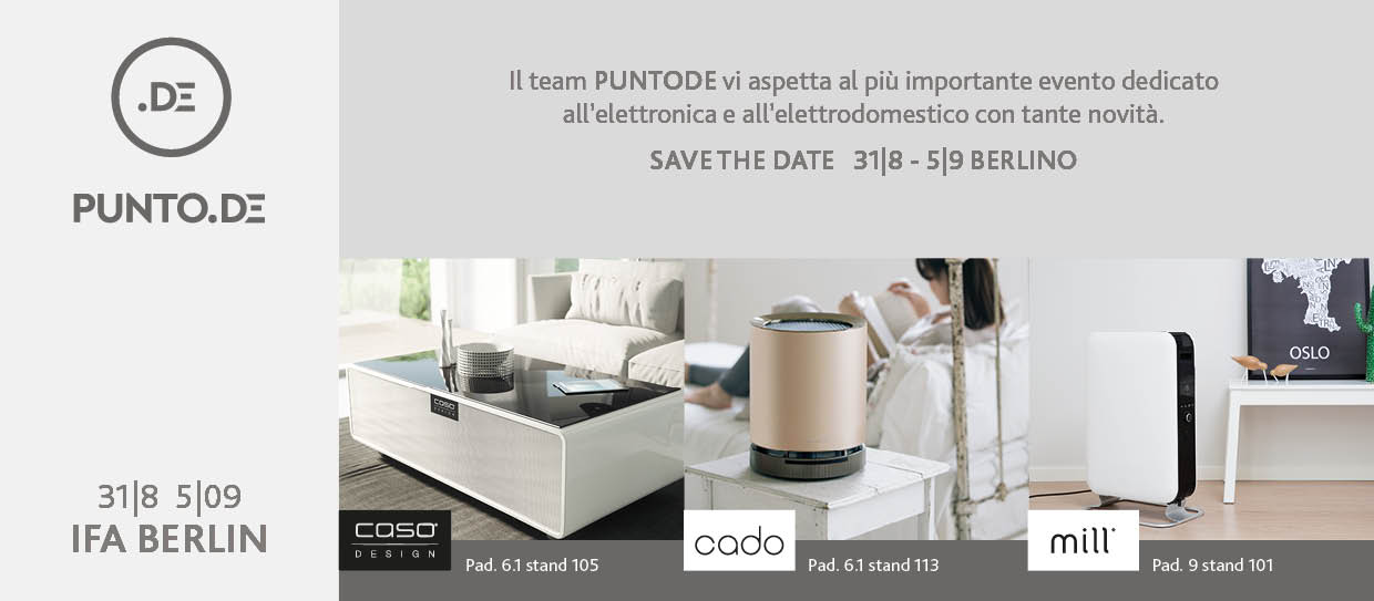 Punto De parteciperà ad IFA Berlin dal 31 Agosto al 5 Settembre. Nel corso del più importante evento dedicato all’elettronica e all’elettrodomestico, verranno presentate le ultime novità dei brand Caso Design (Pad. 61 stand 105), Cado (Pad. 61 stand 113) e Mill (Pad. 9 stand 101).