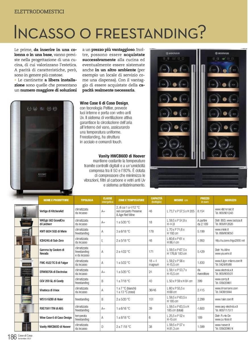Nel servizio dedicato alle cantinette per il vino viene consigliata la cantinetta da sei bottiglie di Caso Design di cui è riportata un’immagine molto ben visibile in pagina.
