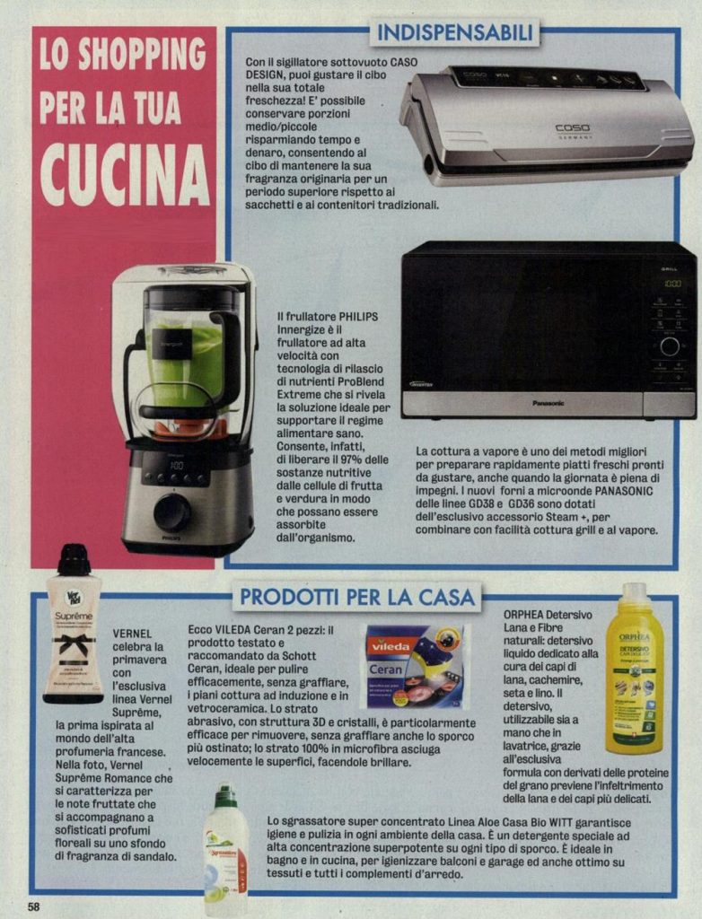 Nella rubrica “Lo shopping per la tua cucina”, fra i prodotti “indispensabili” viene consigliata la macchina per mettere sottovuoto gli alimenti di Caso Design.