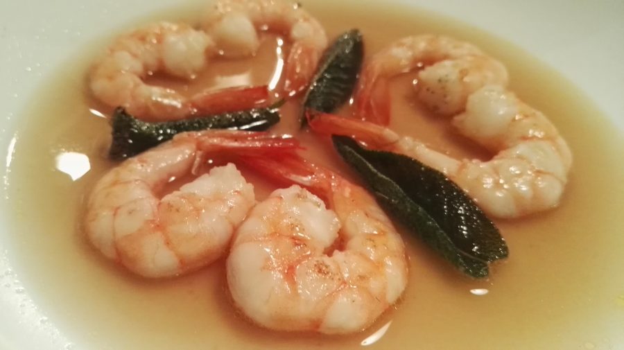 Mazzancolle sous vide, la loro bisque e la salvia fritta.