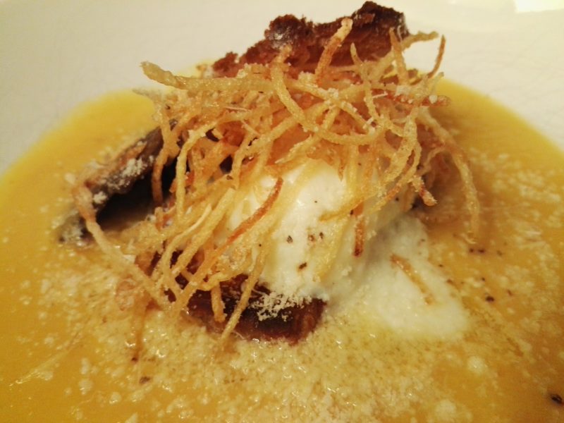 Vi descrivo il piatto: uovo cotto a 65°, vellutata di zucca allo zenzero, porcini saltati, sfoglie di pane al parmigiano e fili di patate croccanti